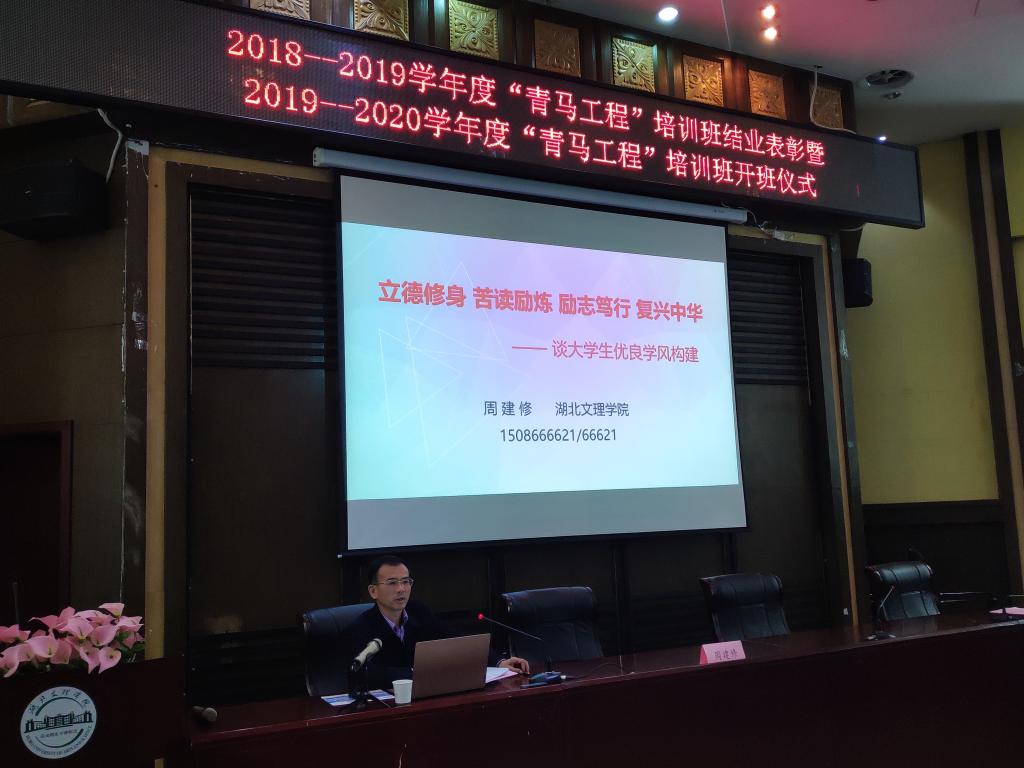 开班仪式后,周建修以《立德修身、苦读励炼、励志笃行、复兴中华——谈大学生优良学风构建》为题,从加强学风建设的重要性与形势要求;什么是学风,什么是优良学风;学风建设的目标;如何考核评价学风;新时代青年大学生在优良学风建设中勇担任等五个方面对大学生优良学风构建进行了系统的阐述,并对同学们提出了“发挥六个作用、做好六个模范、营造六种风气、做到六个‘好’、做好六个引”的具体要求和希望。