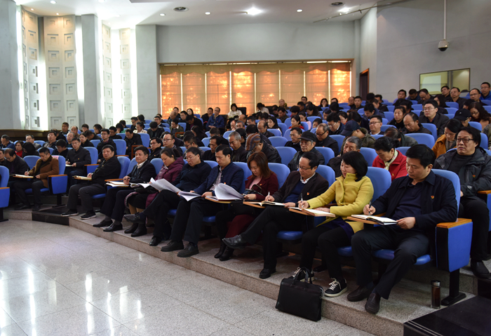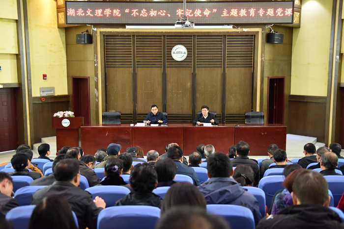 (宣传部 通讯员 李平)11月18日下午,根据学校“不忘初心、牢记使命”主题教育工作安排,学校党委书记唐峻结合主题教育开展以来深入学习的体会感悟和实践思考,为我校校领导、副处级以上干部、机关党委全体党员、离退休党员代表作题为《牢记初心使命担当作为落实 推动学校事业高质量发展》主题教育专题党课。省委第十巡回指导组组长朱训集及指导组成员出席活动,党课由校长丁世学主持。
