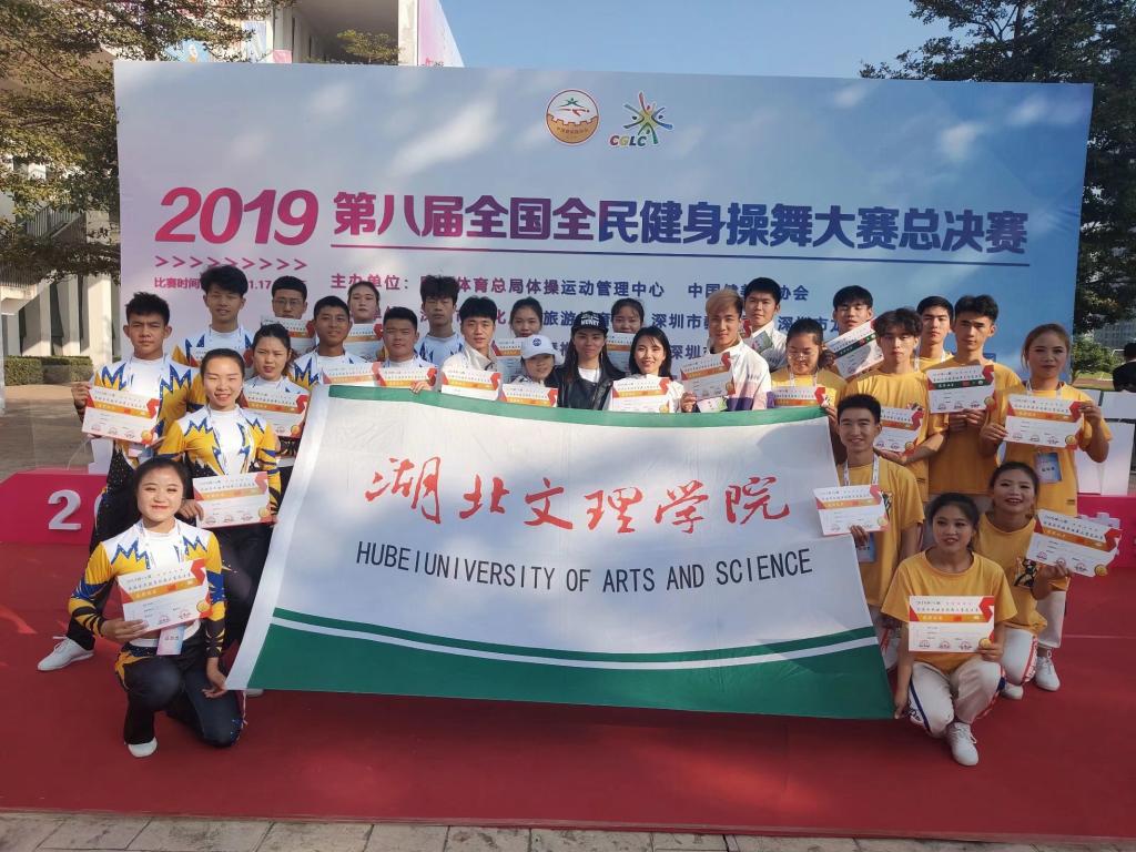 (体育学院 通讯员 王美楠 朱佳豪)2019第八届全国全民健身操大赛总决赛近日在深圳市举行,我校健美操队主教练王美楠带领26名体育学院运动员参赛,获街舞类综合风格齐舞全国一等奖,获有氧健身操舞类轻器械健身操二级、有氧舞蹈二级、全国校园踏板操规定套路全国二等奖。