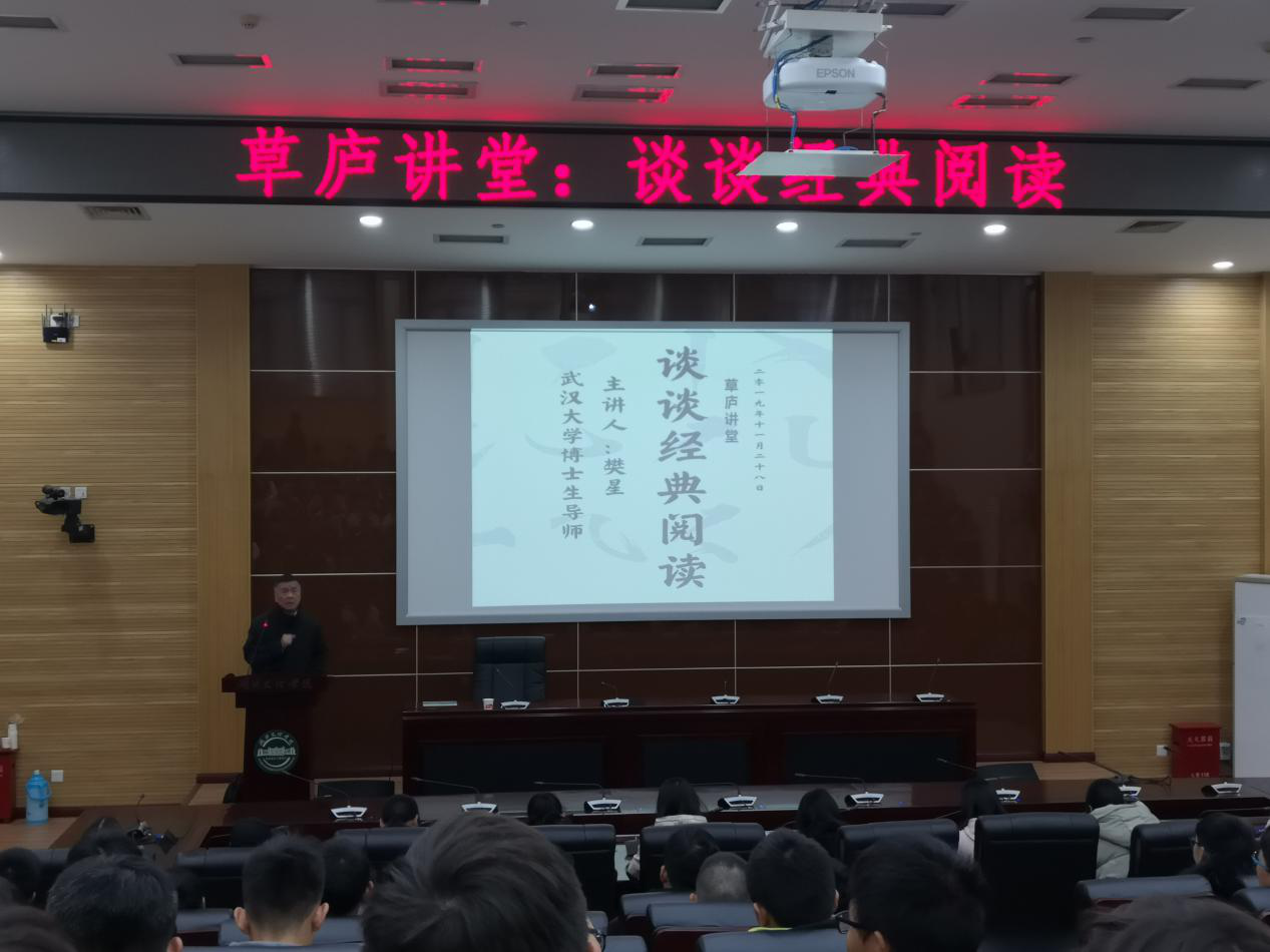(机械工程学院 通讯员 万倩怡)11月28日下午,应机械工程学院邀请,武汉大学文学院教授、博士生导师樊星做客草庐讲堂,在图书馆多功能报告厅为机械学院200余名师生作题为《谈谈阅读经典》的专题讲座。讲座由机械工程学院党委副书记王超主持。