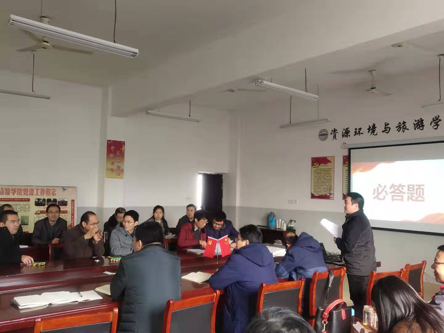 比赛以必答题、抢答题和加分题的形式开展,旅游管理党支部、地理科学党支部、汉江研究院党支部分别派出两名老师参加。竞赛中,参赛选手们聚精会神、反应敏捷,你追我赶,精彩迭出。经过激烈的角逐,最终旅游管理党支部、地理科学党支部、汉江研究院党支部分别获得一、二、三名。