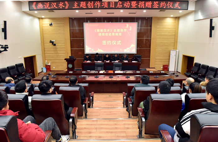 (美术学院 通讯员 杜鹏飞)11月29日下午,《画说汉水》主题创作项目启动暨捐赠签约仪式在学校宁静楼多功能报告厅举行。湖北省学院空间艺术研究院院长苏山、社会爱心人士孙迎春、湖北美术学院教授、博士生导师周益民、知名青年画家韦伶等一行参加活动,校长丁世学出席仪式并讲话。仪式由副校长朱青林主持。