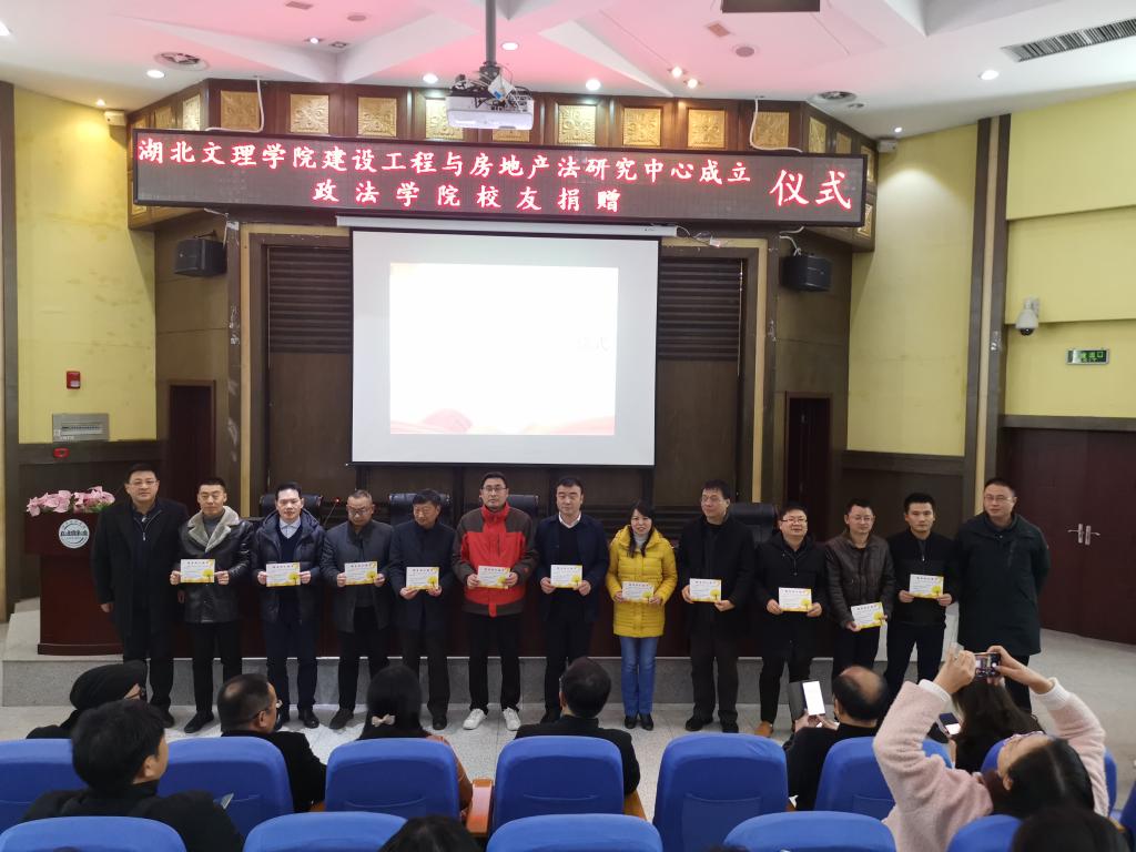 (政法学院 通讯员 刘璐瑶)11月29日晚,湖北文理学院建设工程与房地产法研究中心成立仪式暨政法学院校友捐赠仪式在行政楼一楼报告厅举行。政法学院领导班子成员、学院教师代表、校友代表、湖北忠三(襄阳)律师事务所主任汪涛、副主任李华义参与此次会议,会议由政法学院党委书记王礼刚主持。