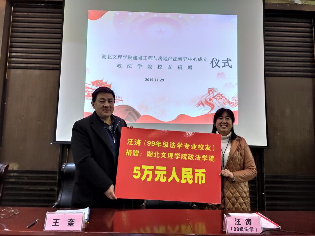 捐赠仪式中,王奎分别与汪涛、校友代表刘新平签订了《湖北文理学院教育发展基金会捐赠协议书》。其中,湖北忠三(襄阳)律师事务所向政法学院捐赠人民币10万元,99级法学专业校友汪涛向政法学院捐赠人民币5万元,用于学院的建设和发展。