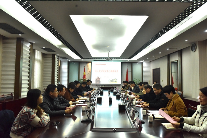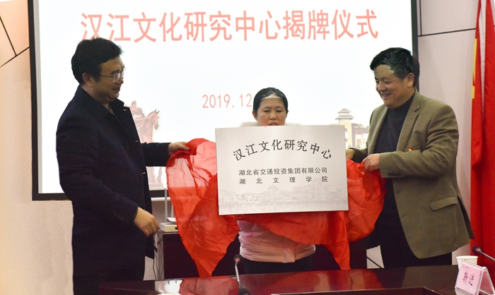 (科技处 通讯员 赵雅心)12月4日下午,我校与湖北交投联合成立汉江文化研究中心的揭牌仪式在行政楼第三会议室举行。校长丁世学,湖北交投襄阳城市发展有限公司执行董事、襄阳文旅发展有限公司总经理周会敏一行,襄阳市发展改革研究中心主任李地宝,湖北日报驻襄阳记者站站长夏永辉,湖北广播电视台襄阳记者站站长甘泉等参加揭牌仪式。揭牌仪式由科技处处长吴钊主持。丁世学与周会敏共同为汉江文化研究中心揭牌。