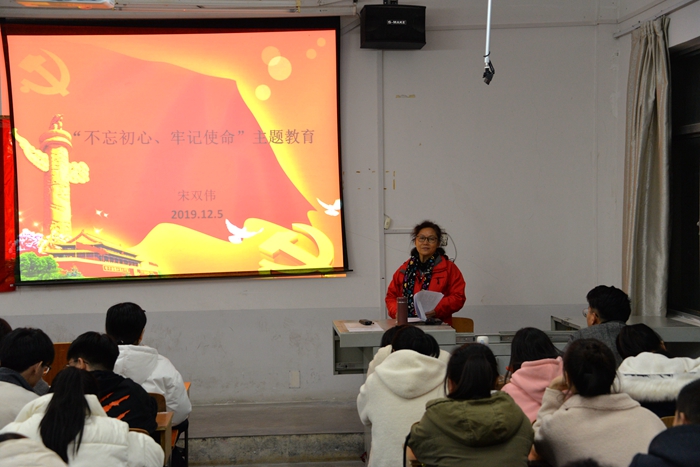 宋双伟在讲授党课时指出,同学们要深刻理解作为一名当代大学生所担负的初心与使命,要在生活中做到“不忘初心、牢记使命”;要深刻认识到开展主题教育的重要意义,深入学习贯彻习近平新时代中国特色社会主义思想;青年大学生要有明确的理想追求,树立远大理想,融入伟大时代。