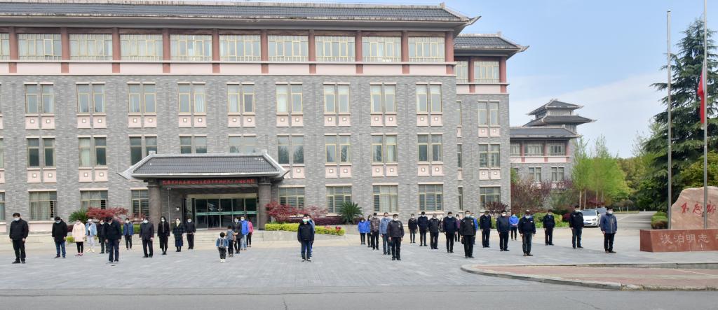 4月4日上午10时,致远楼前国旗下,党委书记唐峻和在校值班的教职工集体向新冠肺炎疫情牺牲烈士和逝世同胞默哀3分钟。
