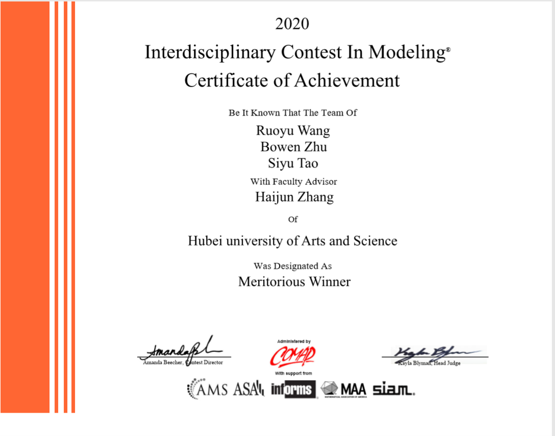 美国大学生数学建模竞赛(MCM/ICM)由美国数学及其应用联合会主办,是当今影响力最大的国际性数学建模竞赛,比赛着重强调研究和解决方案的原创性、团队合作、交流及结果的合理性,赛题内容涉及经济、管理、环境、资源、生态、医学、安全等领域。竞赛要求3名本科生组成参赛队,在4天内,就指定的问题完成从建模、求解、验证到论文撰写的全部工作。今年我校第一次组队参赛,为了更好地完成比赛,队员们从1月14日期末考试结束就开始着手准备。准备阶段面临的最大问题就是缺少资源和参赛经验,指导老师和队员们通过网络、公众号、CSDN等途径查找优秀获奖论文、比赛经验分享等资料,经过一个多月的紧张学习终于对比赛有了比较清楚的认识。竞赛于2月14日—2月17日举行,受新冠肺炎疫情影响,团队成员都在居家隔离中,教师指导、团队交流、英文论文撰写都遇到很大的困难。团队利用线上交流,凭借扎实的基础、良好的团队协作精神,经过四天的持续努力,高质量完成了题目分析、数学模型建立、算法实现、验证及英文论文撰写,最终在众多选手中脱颖而出。