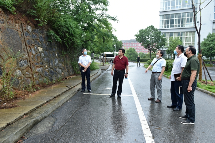 丁世学先后到校园重点山体泥石流滑坡区域和淡泊湖泄洪口进行现场检查,听取了相关职能部门负责人的情况汇报。