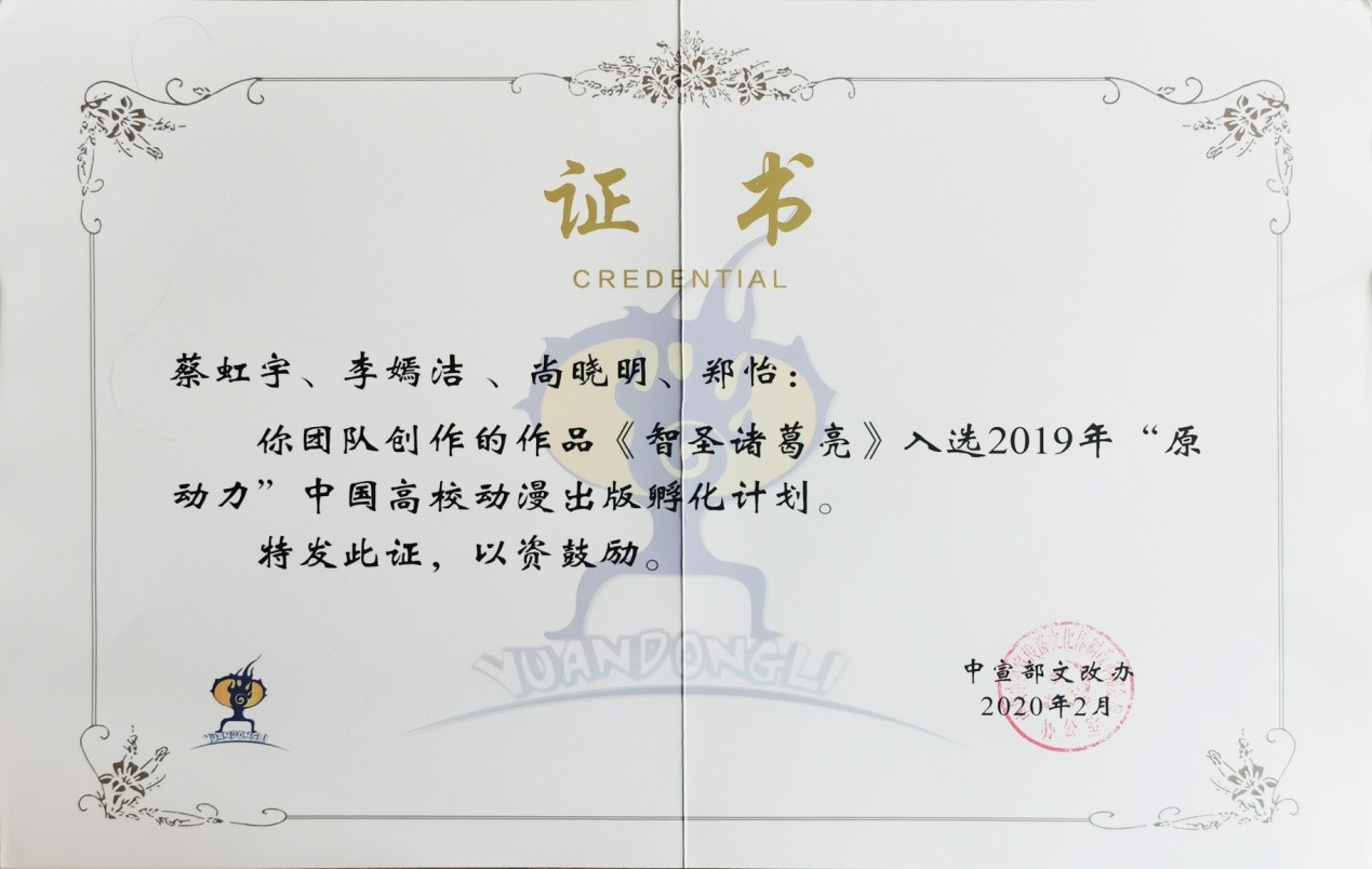 (美术学院 通讯员 尚晓明)近日,中共中央宣传部、中央文化体制改革和发展工作领导小组办公室公布了2019年“原动力”中国高校动漫出版孵化计划入选作品名单,我校美术学院动画系漫画系列作品《智圣诸葛亮》入选该计划。