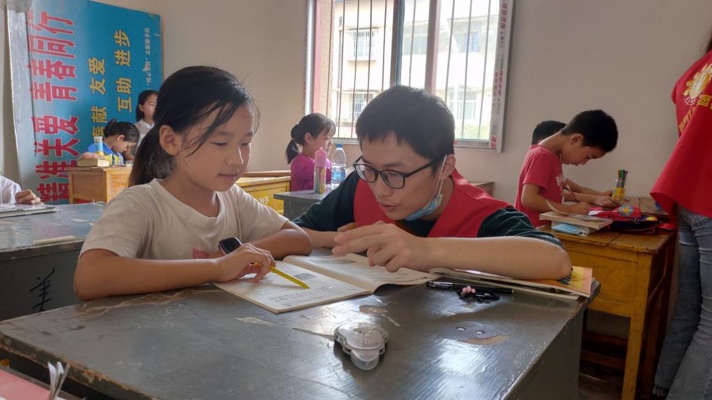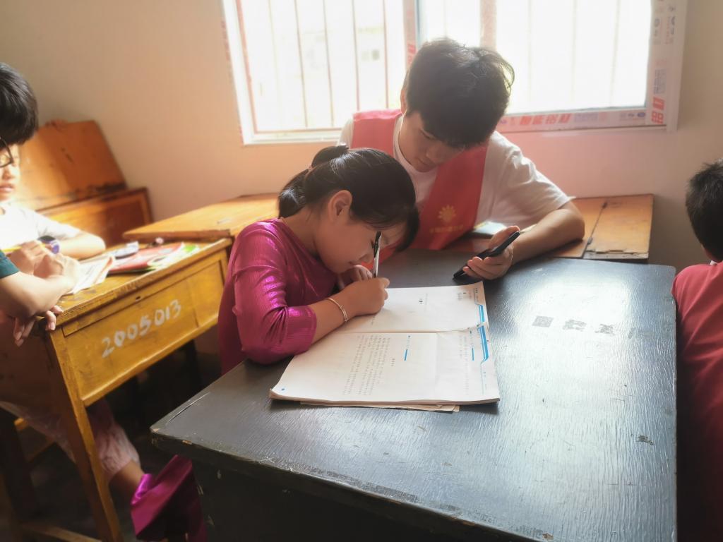 义教队员辅导学生写作业