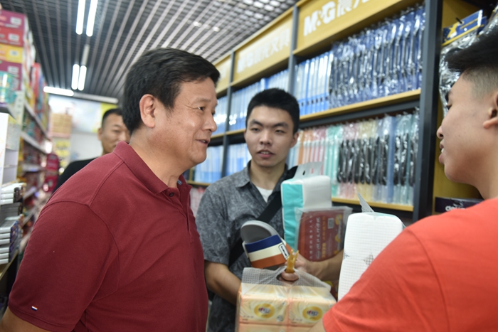 在凤雏家园超市,丁世学询问正在购物的同学,“需要的生活物品都能买到吧?”,丁世学叮嘱超市负责人,要及时补充库存,保证学生所需供应充足。