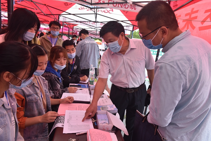 在学校大门口,丁世学与物电学院来自山西临汾的新生李子园及其家长交流,丁世学说:“感谢家长的信任把孩子送到湖北文理学院,”他叮嘱李子园:“上大学之后要继续努力学习,让自己变得更优秀,四年后不后悔今天的选择。”