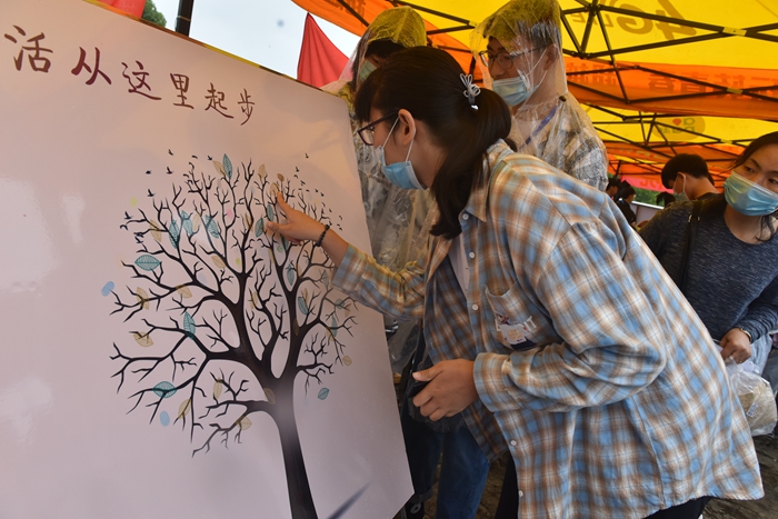 今年,学校在校内设置了“新家湖文欢迎你”“刻苦读书 坚持锻炼 建设强国 复兴中华” “梦想墙”“2020级萌新笑脸墙”等迎新纪念点。雨幕中,新生及其家长在新生笑脸墙寻找自己的照片,并在笑脸墙前合影留念;在梦想墙,新生写下对大学生活的期待与憧憬。