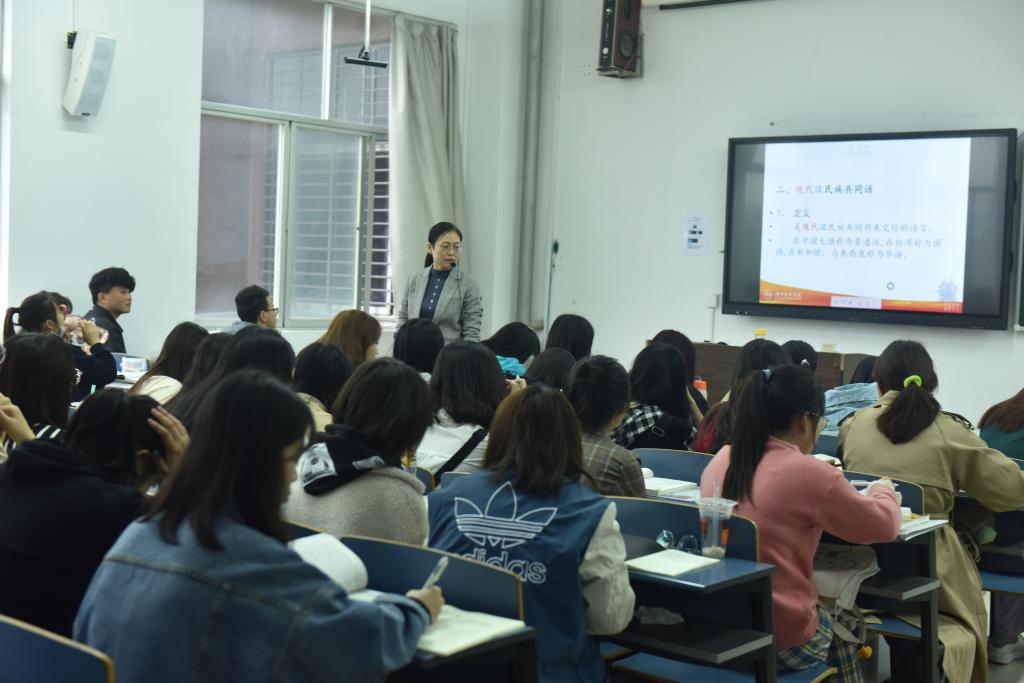 “湖北的方言属于什么方言区?”“北京话就是普通话吗?”“北京话与襄阳话有什么区别?”……在《现代汉语》课上,文学与传媒学院讲师杨琳给同学们提出了问题,启发同学们思考普通话的规范化进程,又从北京话、襄阳话在声母、韵母、声调方面的区别引导学生理解普通话的标准音等。课堂上,同学们积极思考、讨论活跃。丁世学就教学准备与教学方法与余燕敏、杨琳进行探讨,丁世学指出,在课前要备好课,做好充分准备;在授课过程中要把握好节奏,在知识点切换时要抓紧同学们的注意力。