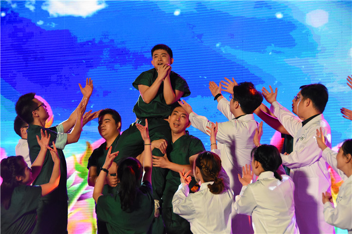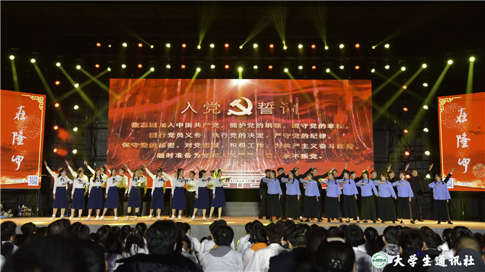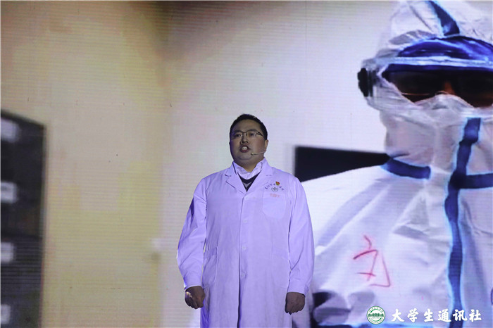 在“誓言”篇章,通过艺术再现,把观众重新带回到那段齐心合力、共克时艰的“抗疫”时光。学校附属医院急诊重症医学科主任曹锋生现场讲述的《离希望最近的地方》和23名医护人员演绎的情景剧《隐形防线》,道出了医护工作者与新冠病毒争斗博弈的昂扬斗志和大爱无私;现场四千余学子齐唱《听我说 谢谢你》,向守护校园一方平安的广大师生致敬,更向伟大人民、伟大祖国致敬!原创情景剧《居家的日子》用幽默对比的方式,启迪和引导广大学子要珍惜居家学习时光,积极“读书、锻炼、做公益”;合唱《我宣誓》以激昂的旋律和震撼的画面,把短短80个字的入党誓词演绎得气势恢宏,喊出了心系家园,报效祖国的铮铮誓言。