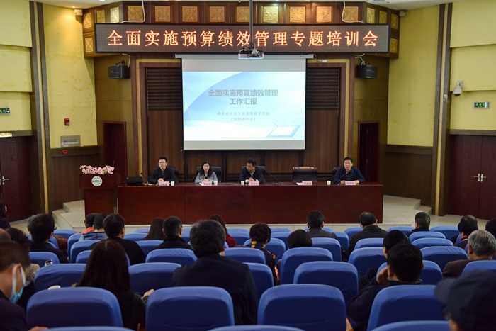 (计财处 通讯员 乔瑞豪)11月5日上午,学校在致远楼一楼报告厅举行全面实施预算绩效管理专题培训,邀请省财政厅预算绩效管理处处长廖学东、副处长熊亚芬分别作辅导报告。省财政厅驻襄阳片(襄阳、十堰、神农架)书记、襄阳办主任蔡晓青、襄阳市财政局副局长王晓静出席会议,学校机关及直附属单位负责人、办公室主任,二级学院负责人、专业负责人、学科办主任,计财处全体人员参加培训。培训会由副校长朱青林主持。