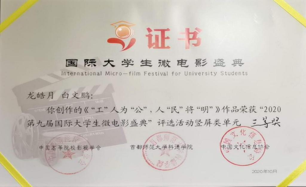 (文传学院 通讯员 白文鹏)近日,由中国高等院校影视学会主办的“第九届国际大学生微电影盛典”在宁夏银川举行,我校文传学院编导16级学生龙皓月和17级学生白文鹏,在杨铮老师指导下导演拍摄的作品《“工”人为“公”,人“民”将“明”》,从来自国内外280余所高校的5000余件参赛作品中脱颖而出,获得竖屏类三等奖。