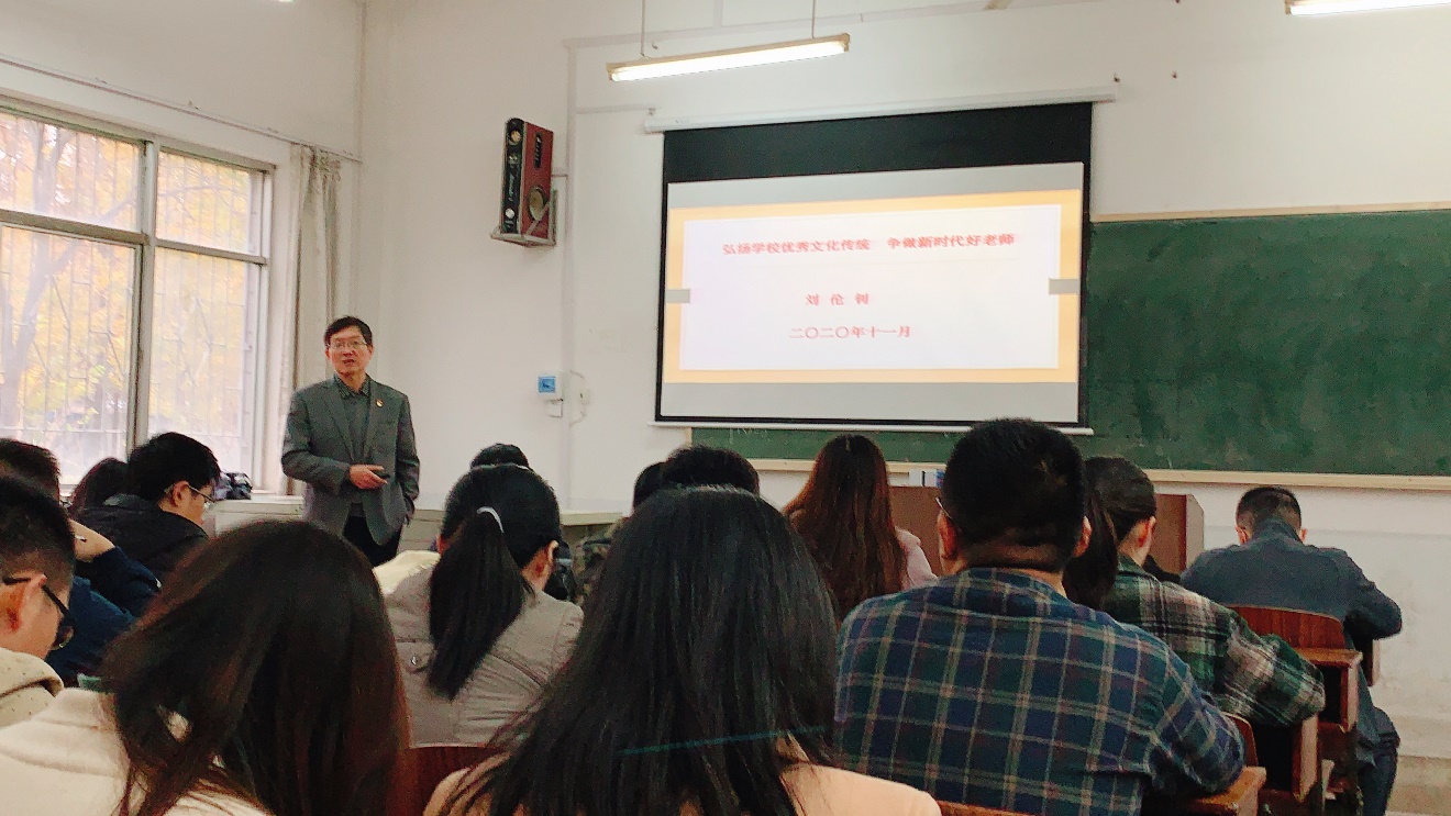 (人事处 通讯员 焦树国 胡世平)11月20日下午,新进教师校本培训第七讲在教学楼N4-103举行,副校长刘伦钊为我校50余名新进教师作题为《弘扬学校优秀文化传统争做新时代好老师》的专题培训报告。