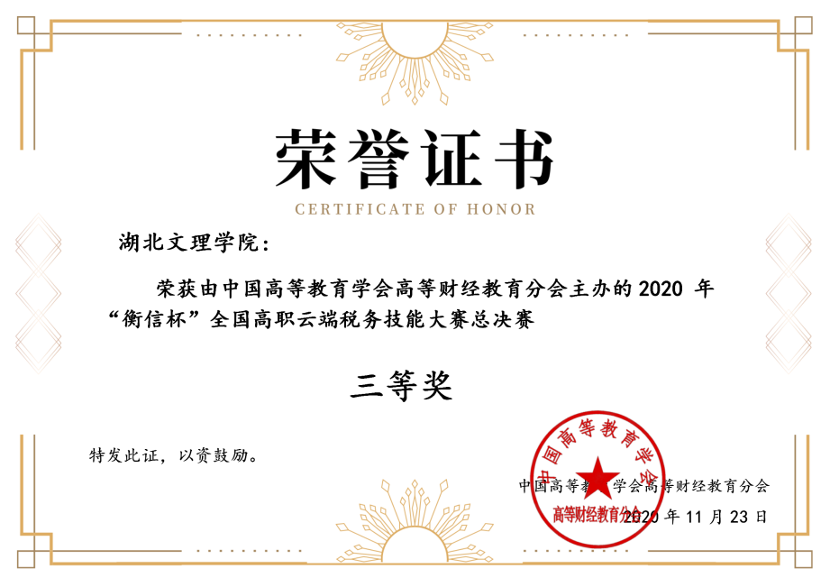 (经管学院通讯员程传勇)近日,2020年“衡信杯”全国高职云端税务技能大赛总决赛在线上举行。我校经管学院学生丁子琛、张丹丹、周堃组成的代表队(指导教师:程传勇、陈春艳)经过激烈角逐,获得大赛三等奖。